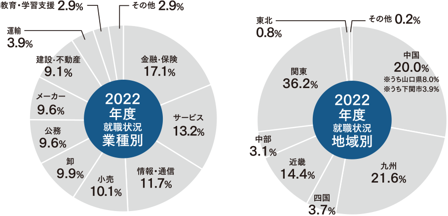 2022年度卒業生の就職率は98.8%となりました。就職先として、金融機関が最も高く、年々公務員になる学生も増えてきました。本学学生は、山口県を含む中国地方への就職だけでなく、関東や九州など様々なエリアに就職しており、卒業生は全国的に活躍しています。