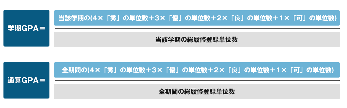 成績評価に応じて与えられる数字をGP(Grade Point)といい、後述する式に当てはめるとGPAを算出できます。