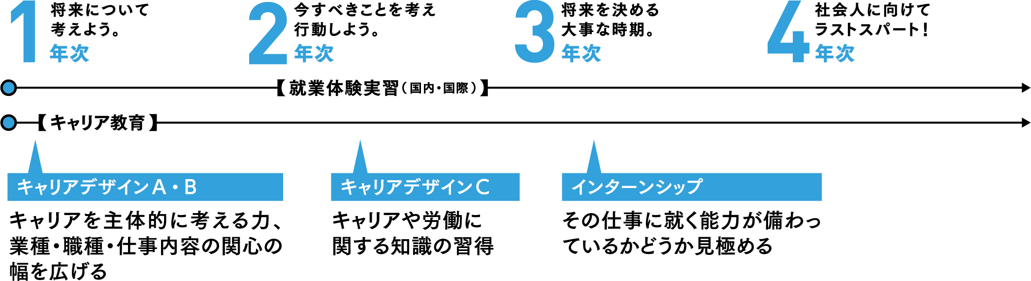 体系的なキャリア教育プログラムのもと、学生の就業意識を涵養し、「キャリア」を主体的に設計することができる人材を育成し ます。