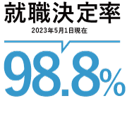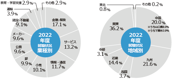 2022年度卒業生の就職率は98.8%となりました。就職先として、金融機関が最も高く、年々公務員になる学生も増えてきました。本学学生は、山口県を含む中国地方への就職だけでなく、関東や九州など様々なエリアに就職しており、卒業生は全国的に活躍しています。
