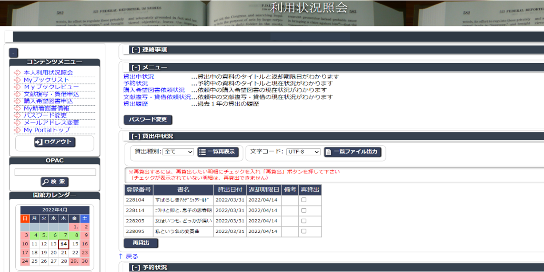 貸出中状況、予約状況、図書購入申込、文献複写・借用依頼状況、貸出履歴(過去1年分)を見ることができます。