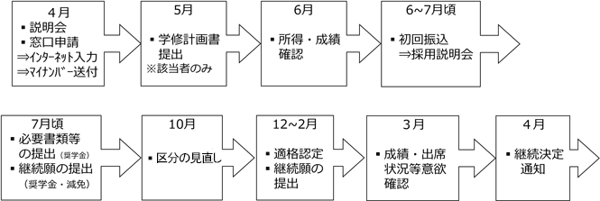 申請は、大学が開催する説明会に出席し申請書類等を受け取ったうえで、指定する期日までに申請書類等の提出を行ってください。各説明会については、大学のホームページおよび学生支援課の掲示板でお知らせしますので、定期的に確認するようにしてください。